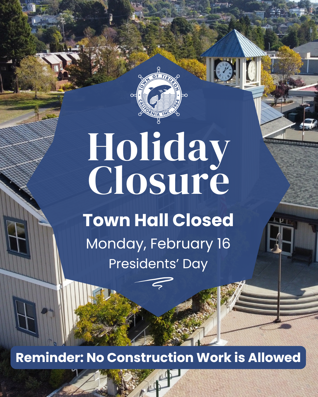 Tiburon Town Hall will be closed on Monday, February 16, 2026 in observance of the Presidents' Day holiday. No construction work is permitted. Town Hall will resume regular operating hours on Tuesday, February 17, 2026.