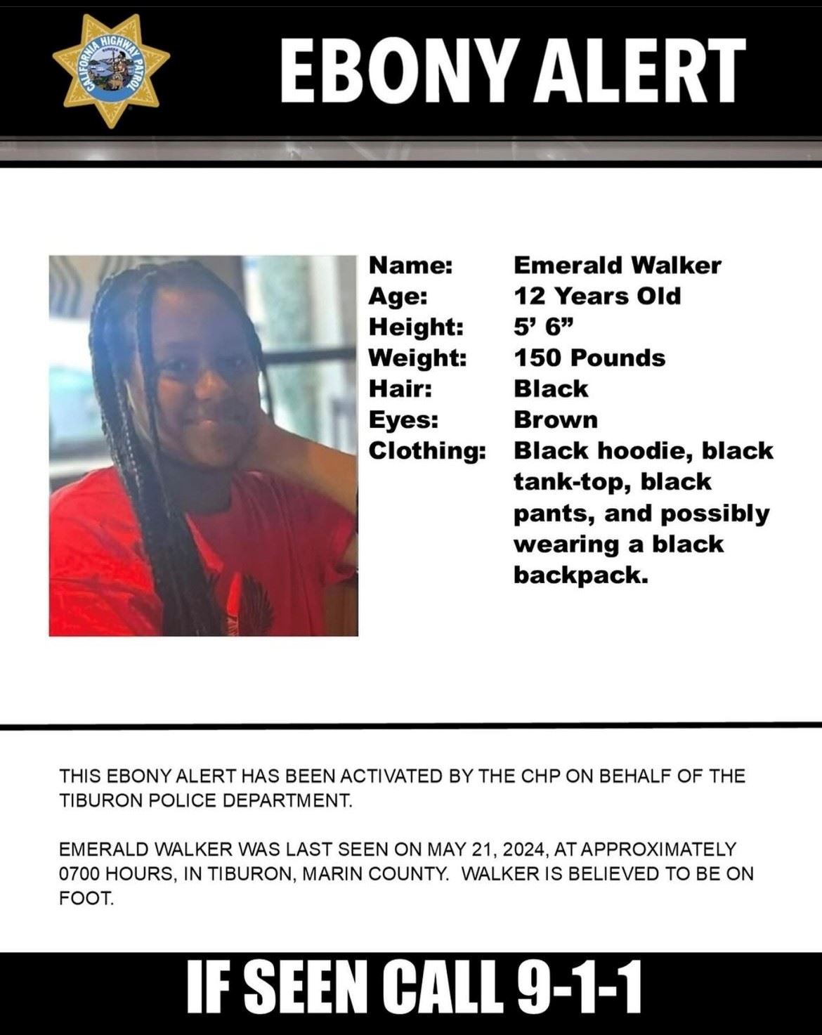 Missing 12-year old, Emerald Walker, has been found by Tiburon PD and is safe.