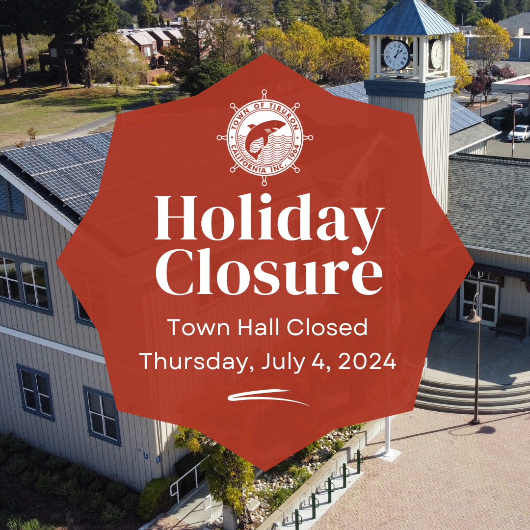 Tiburon Town Hall will be closed on Thursday, July 4, 2024 in observance of the Independence Day holiday. No construction work is permitted. Town Hall will resume regular operating hours on Monday, July 8, 2024.