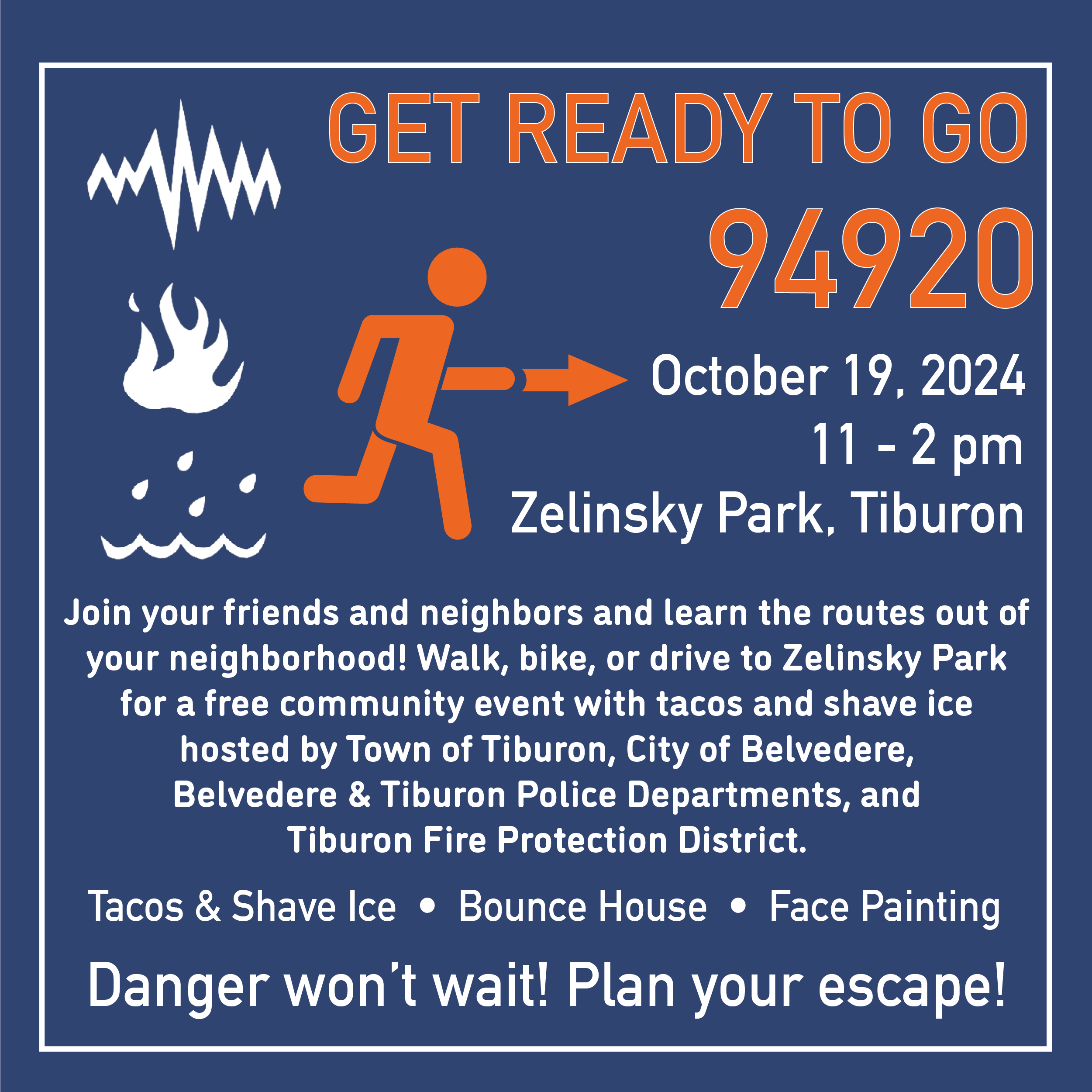 Join your community on October 19th for the 3rd annual Get Ready To Go 94920 festival! Walk, ride, or drive around the community and familiarize yourselves with the routes in and out of your neighborhood and city/town. Then join your neighbors for a fun and educational time at Zelinsky Park (behind Tiburon Town Hall).