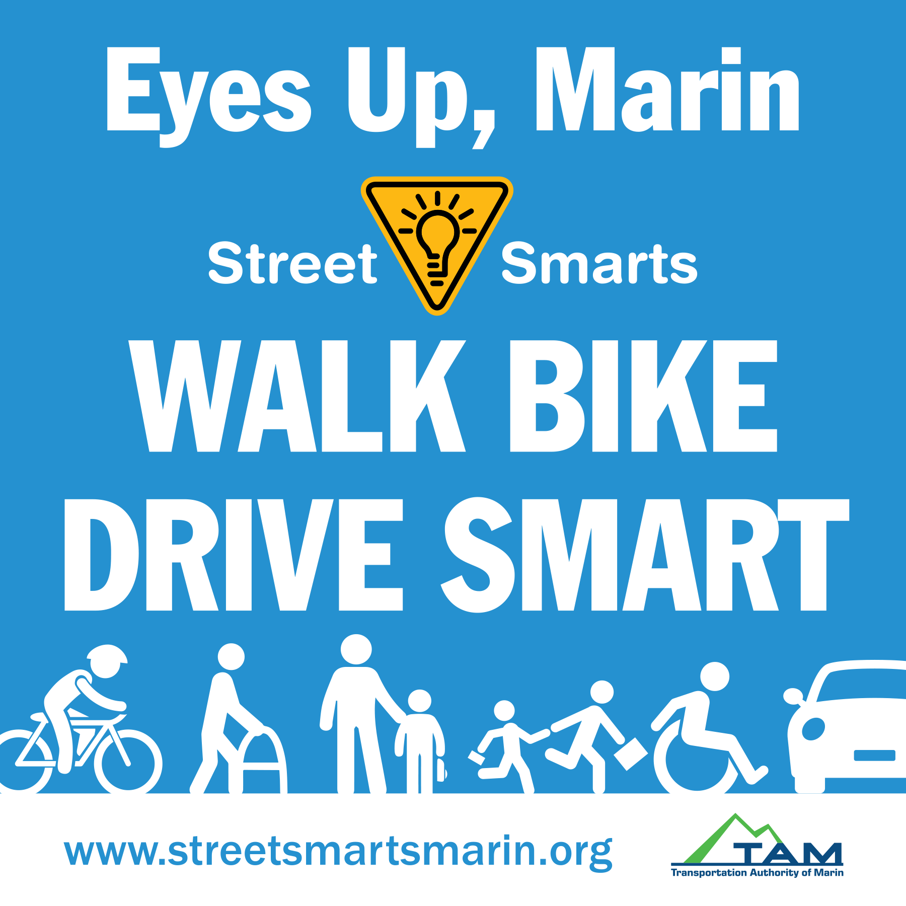 The Eyes Up, Marin campaign is part of the Street Smarts Program and Safe Routes to Schools, locally funded programs of the Transportation Authority of Marin. This traffic safety campaign educates drivers, pedestrians and cyclists about safety issues, including distracted driving. The goal is to encourage people to adopt and practice attitudes and behaviors that will reduce the number of traffic-related accidents and make our streets safer for everyone.