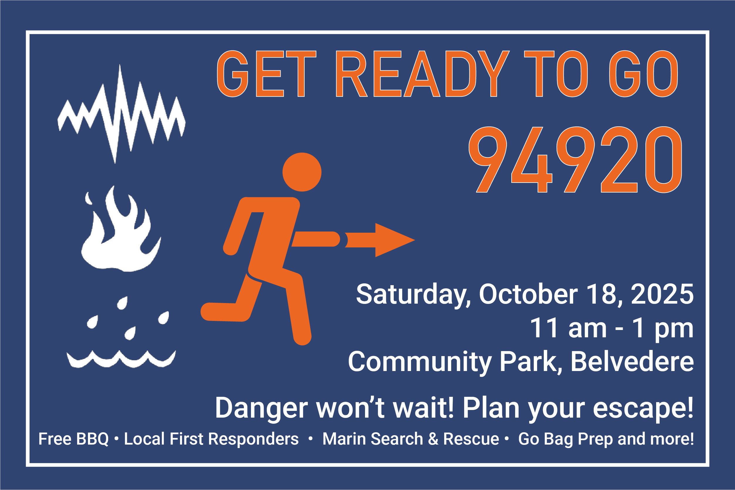 Join us at Belvedere Community Park (450 San Rafael Ave) on Saturday, October 18, from 11:00 a.m. to 1:00 p.m. for the annual Get Ready to Go 94920 preparedness event. Enjoy a free community BBQ catered by Forrest Fire Barbeque while connecting with local first responders from the Belvedere and Tiburon Police Departments, Tiburon Fire Protection District, and Southern Marin Fire Department.
