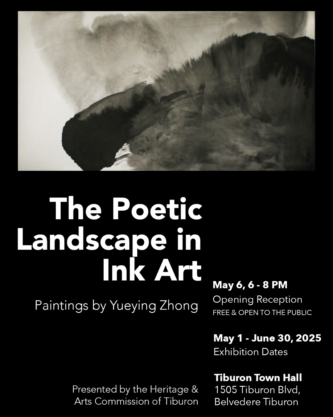 The Town of Tiburon’s Heritage & Arts Commission is pleased to present The Poetic Landscape in Ink Art, featuring the masterful works of acclaimed artist Zhong Yueying at the Tiburon Town Hall from May 1 to June 26, 2025. Born in Heilongjiang, China, Zhong earned his Bachelor of Arts and Master of Fine Arts degrees from Luxun Academy of Fine Arts, where he now serves as a guest professor. His artwork has been exhibited at prestigious institutions across China, the United States, South Korea, and Taiwan, including Tsinghua University Art Museum, Saint Louis University Museum of Art, and Taiwan University of Arts. A prolific scholar and author of four books including "Charm & Style" and "The Original Art Creation," Zhong has received international recognition with awards such as the Wu Zuoren International Fine Art Exchange Foundation Award and the Special Overseas Grand Prize at the Asian International Ink and Brush Painting Exhibition in Tokyo. Meet this distinguished Marin-based artist at the opening reception on May 6 from 6 to 9 PM. All are welcome to this free event celebrating Zhong's poetic interpretation of landscape through the expressive medium of ink art.