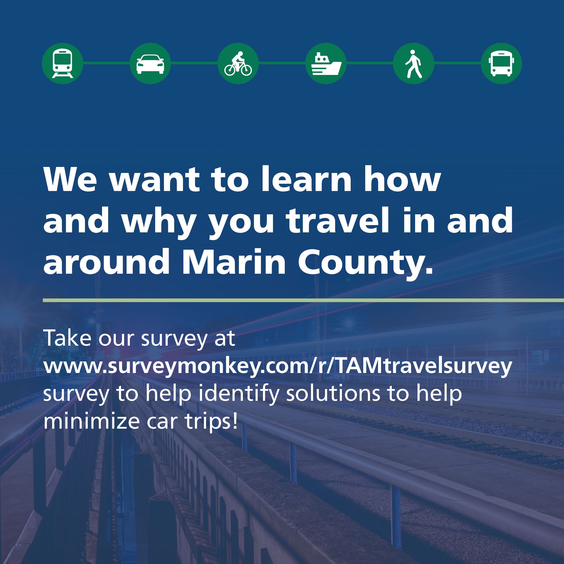 Your participation in this study, funded by a Caltrans Sustainable Communities grant, will help us identify key areas for improvement and contribute to the development of effective strategies aimed at reducing car trips while paving the way for a better travel experience in Marin County. Learn more on the project webpage and take the survey.